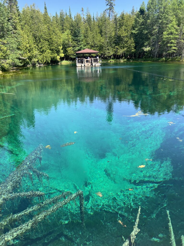 From Munising, we drove about an hour southeast toward the coast of Lake Michigan to visit Kitch-iti-Kipi Springs. The pronunciation alone is a great conversation starter for the drive—trust me. I still don’t know if I’m saying it correctly. You can take your best guess or ask a local once you arrive!
